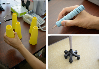 歩行補助器にもいろんな種類があります。最近の杖は持ちやすく、地面との設置面も滑らずしっかり支えてくれます。指先訓練用のリハビリ小道具も色々ありますよ。