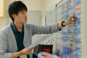訪問予定表を整理しています。限られた人員と時間でお約束の時間に訪問する為に、きっちりとしたスケジューリングは大切な仕事のひとつです。